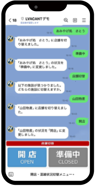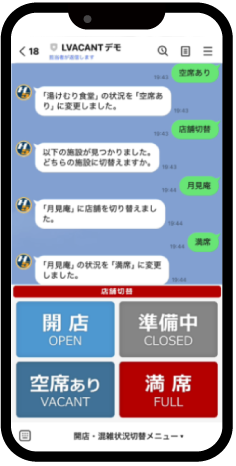- LINEのリッチメニューを利用し、開店・閉店の切替や混雑状況の更新をワンタップで実行可能。特別な知識や専用アプリは不要で、誰でも直感的に操作できます。