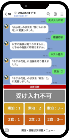 「受け入れ不可」「素泊まり」など宿泊対応状況をLINEで簡単表示。予約前に最新の受け入れ情報を確認可能。